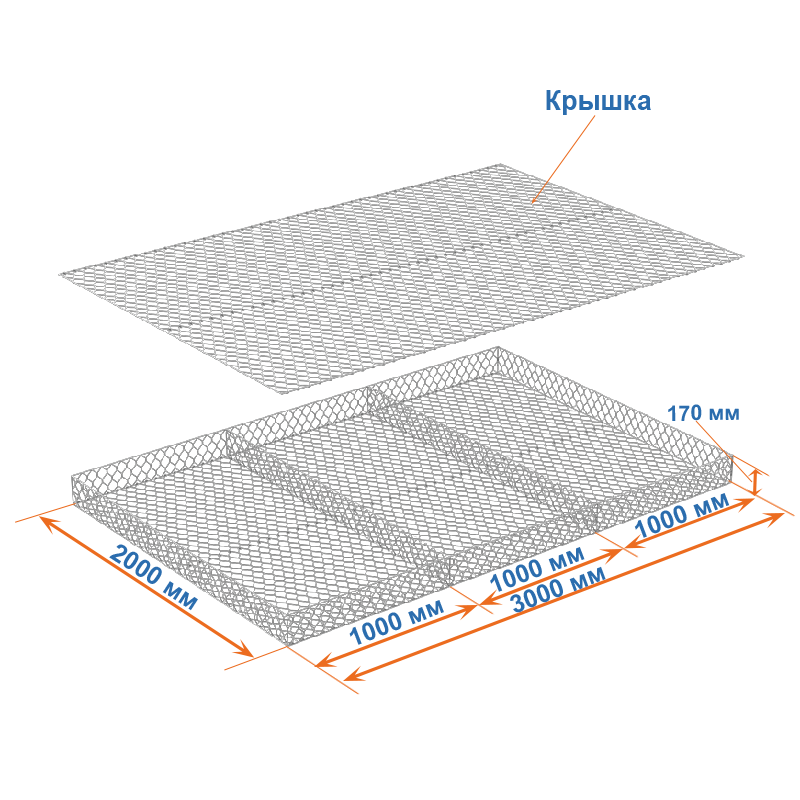 Матрасы Рено 3x2x0,17 — плоские габионные секции из сетки двойного кручения с ячейкой 60х80, проволокой 2,2 мм и покрытием Цинк.