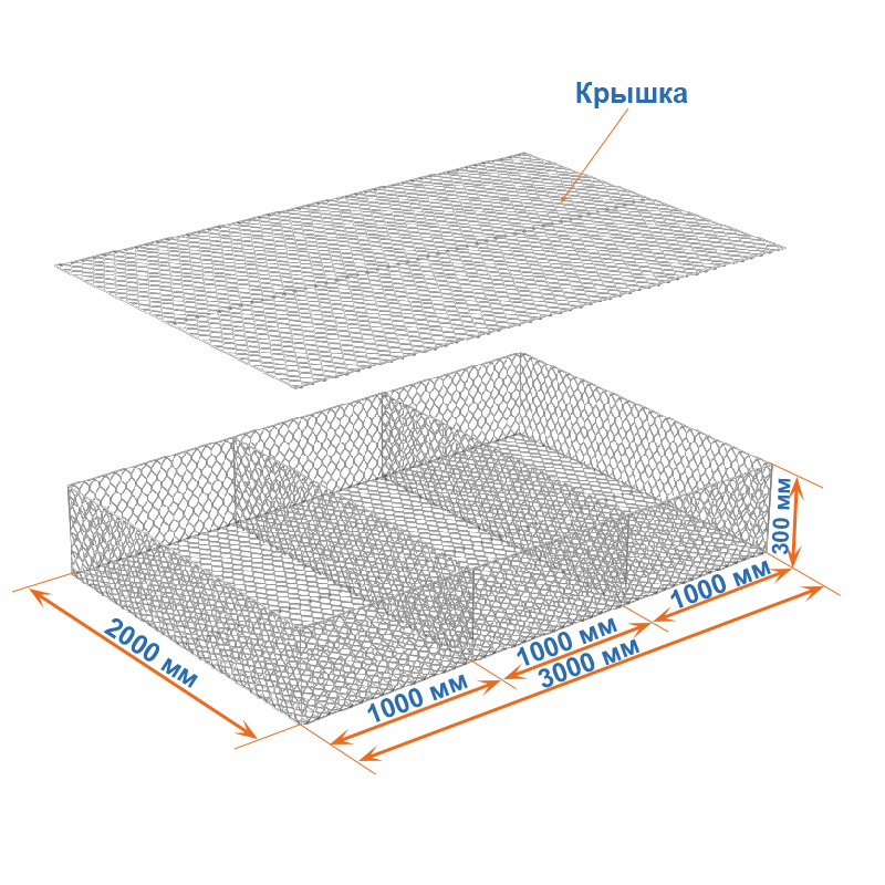 Габионные матрасы Рено 3x2x0,3: ячейка 80х100, диаметр проволоки 2,7 мм, покрытие Цинк.