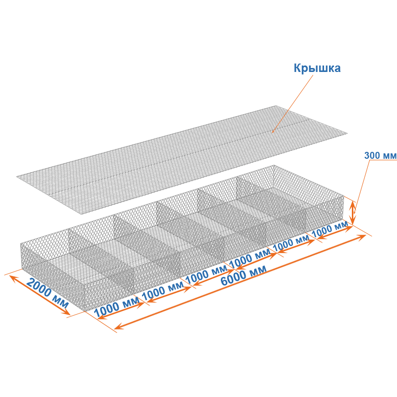 Матрасы Рено 6x2x0,3 — плоские габионные секции из сетки двойного кручения с ячейкой 60х80, проволокой 2,2 мм и покрытием Цинк.